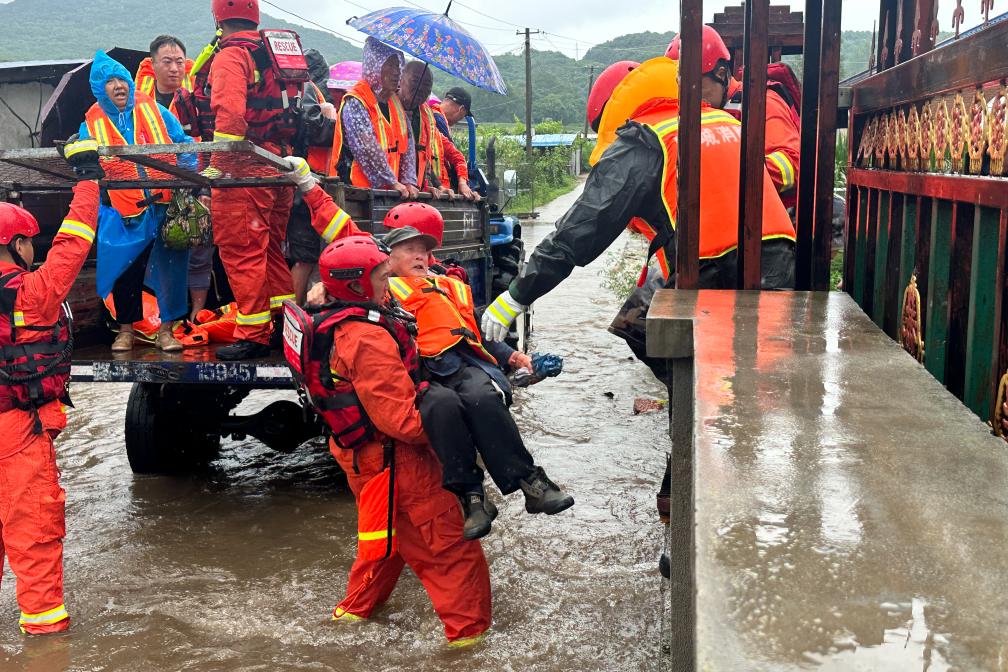 8月4日,在黑龙江省尚志市一面坡镇万山村,哈尔滨市森林消防支队的消防员正在解救被困村民。新华社发