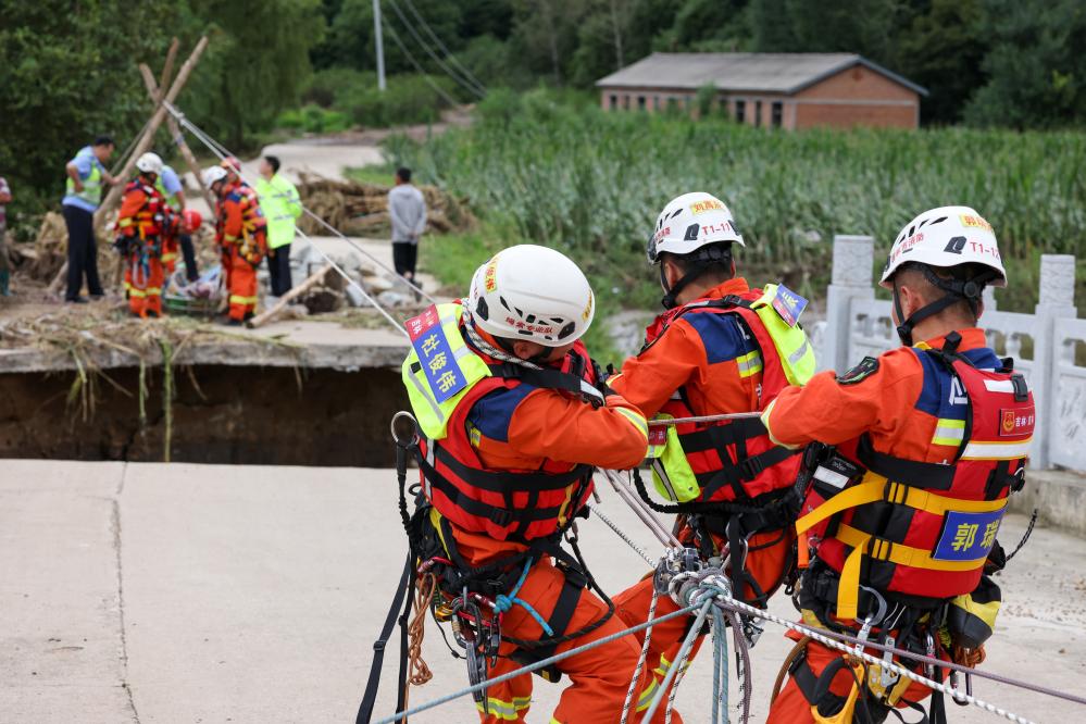 8月6日,吉林市消防救援支队队员利用绳桥解救受困村民。新华社记者颜麟蕴 摄