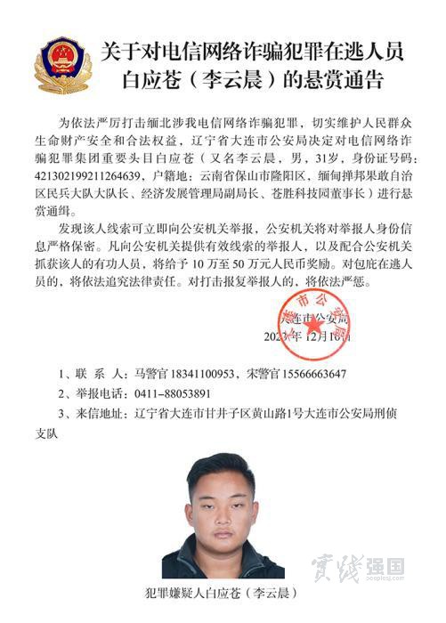 为依法严厉打击缅北涉我电信网络诈骗犯罪,切实维护人民群众生命财产安全和合法权益,辽宁省大连市公安局决定对白所成、白应苍(又名李云晨)、白应兰(又名李梦娜)进行公开悬赏通缉;福建省泉州市公安局决定对魏怀仁、魏榕(又名陈榕)、魏青松(又名杨松)进行公开悬赏通缉;福建省龙岩市公安局决定对刘正祥、刘积光(又名李华光)、刘正茂进行公开悬赏通缉;重庆市公安局决定对徐老发(又名徐发启)进行公开悬赏通缉。